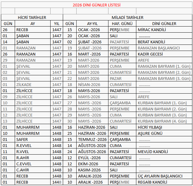 DİNİ GÜNLER TARİHLERİ LİSTESİ 2026