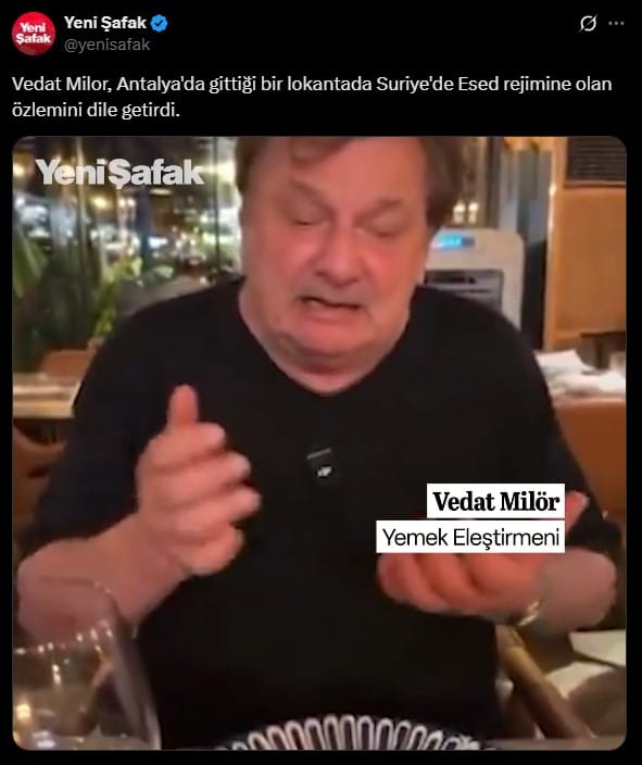 Yeni Şafak, bu sözleri “Vedat Milor, Antalya’da gittiği bir lokantada Suriye’de Esed rejimine olan özlemini dile getirdi” başlığıyla servis etti.